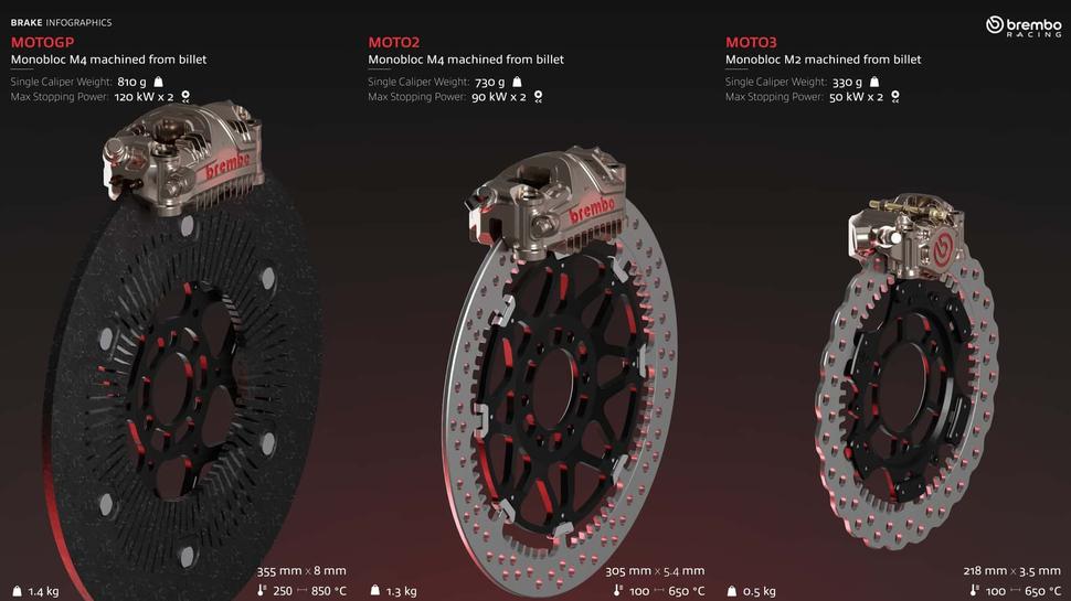 В целом в MotoGP получается более 55 различных вариантов только компоновки тормозных дисков, это не считая других компонентов тормозов. И это, если честно, поражает воображение.